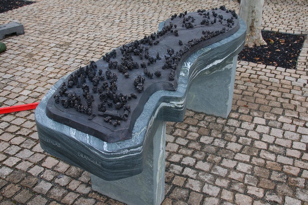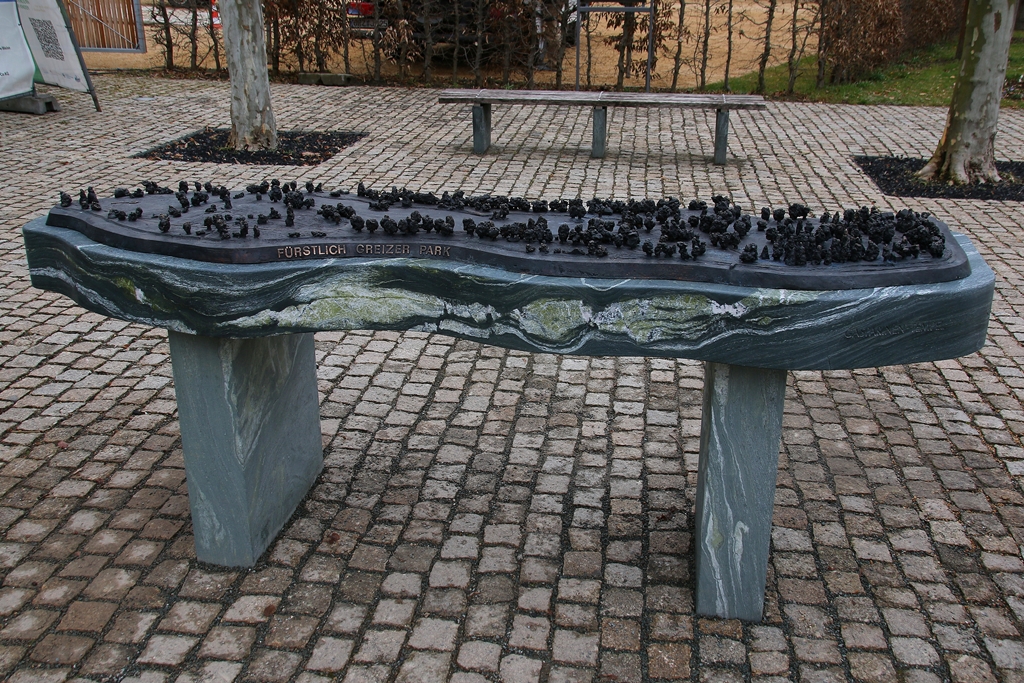 Das reichlich zwei Meter lange Kunstwerk steht im Platanen-Baumsaal auf einem imposanten Unterbau aus Grünschiefer, den die Greizer Steinmetz-Firma Kahnt gefertigt hat. Schöpfer des Bronzegusses ist Friedemann Sander, Inhaber der gleichnamigen Kunstgießerei in Bonn, dem es gelang, das Ambiente der Gartenanlage anhand markanter Parkpartien und -objekte mit künstlerischer Gestaltungsfreiheit zu formen und erlebbar zu machen. Denn es war schnell klar - eine maßstäbliche Wiedergabe der großflächigen Parkanlage ergäbe kein akzeptables Ergebnis. Stattfinden musste eine Auswahl der den Park prägenden Objekte (Bäume, Baumgruppen, Bauten), die dann vergröbert bzw. überhöht, also unmaßstäblich, sichtbar gemacht wurden.