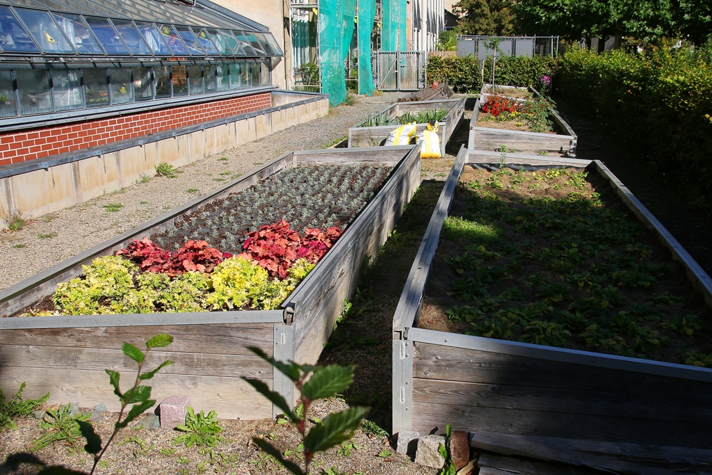 Und wer mal über die Hecke vor dem Parkgewächshaus schaut, entdeckt dort die zur Pflanzenzucht genutzten Frühbeetkästen. 2007 waren diese - als Bestandteil der Neugestaltung des Parkeingangs aus Anlass der BUGA - noch für die Besucher zugänglich.
