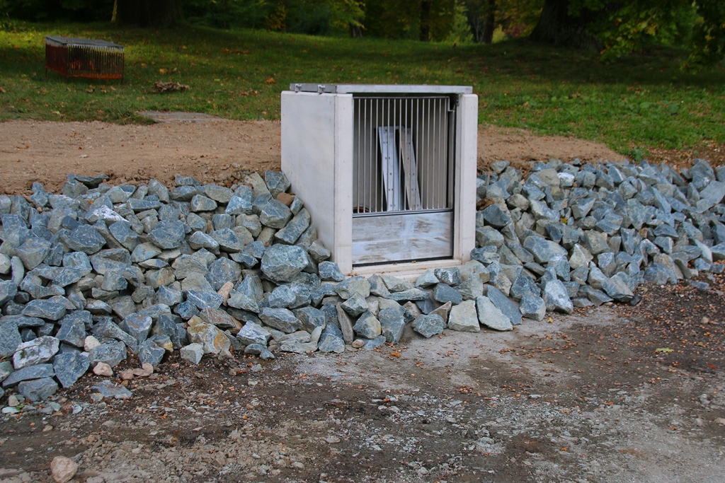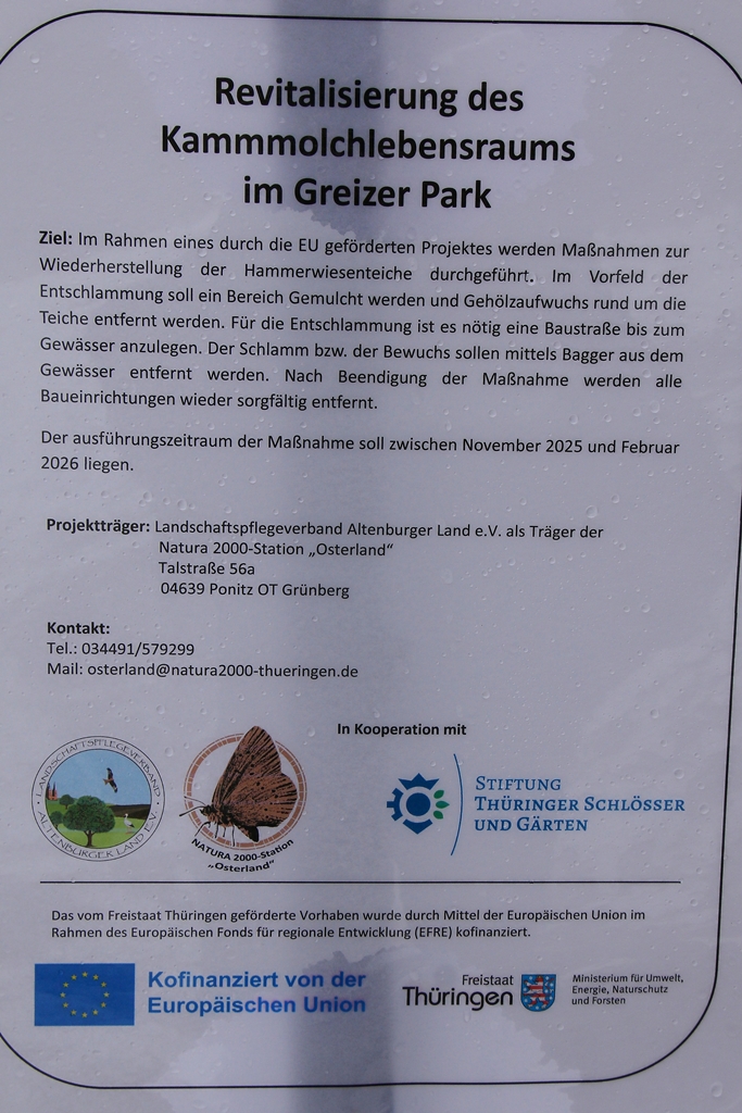 Nachfragen bei der Stiftung ergaben, dass das Ablaufbauwerk am Südende des Sees zu hoch ist, für den notwendigen Austausch gegen ein niedrigeres braucht es eine Senkung des Wasserstands. Dieser „Betonkasten“ ist der Überlauf des Parksees, hier läuft ab Erreichen des Höchstwasserstandes das Wasser ab in die Elster. Wundern darf man sich schon über den Fehler, zeigt doch das Foto des eingebauten Ablaufs vom Oktober 2025, dass er erstaunlich hoch über die ungefähre Ziel-Wasserstandslinie (Oberkante der Ufer-Steinschüttung) hinausragt.