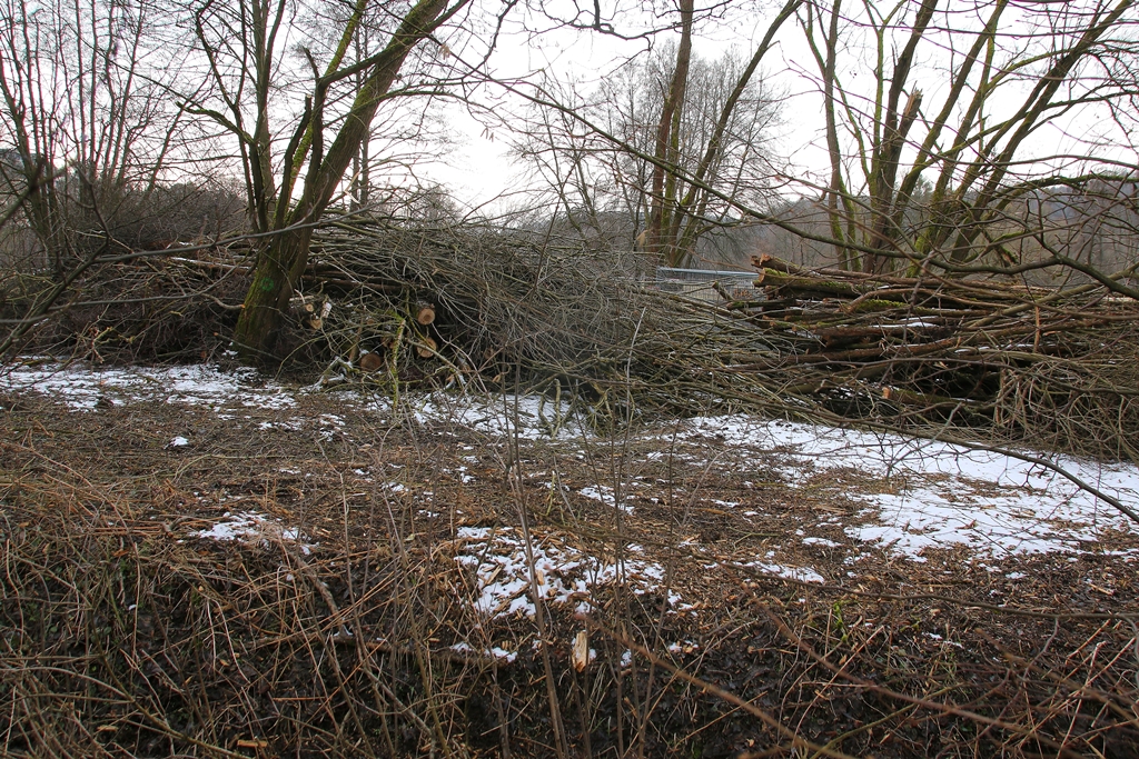 An der Baustelle „Vorstreckteiche“ dominieren immer noch Gehölzarbeiten, ein kleines Schild klärt nun über das Ziel der Arbeiten auf.