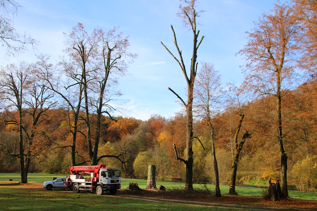 Die im Einzelfall bald 250 jährigen Veteranen der Seufzerallee müssen nicht nur in 30 Meter Höhe vom Totholz befreit werden, leider sind immer wieder Bäume nicht mehr zu halten und müssen gefällt werden. Ein Blick ins Innenleben zeigt, dass die Stämme hohl sind und nur noch von einem äußeren Ring gehalten werden. Die Lücken in der Allee werden damit größer, aber auch hier wird nachgepflanzt. Eine wichtige Entscheidung, auf diese Weise der Allee eine Zukunft zu geben.