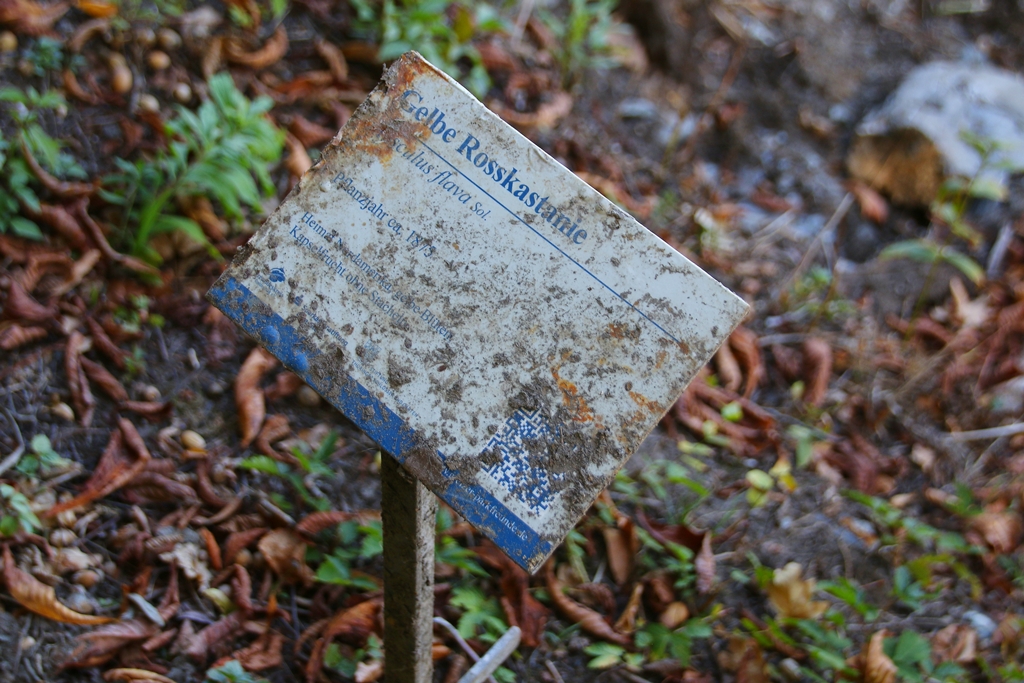 Was der Freundeskreis Greizer Park schon immer vermutet hat, bestätigte ein Fund am Westufer. Aus dem Schlamm wurde ein Baumschild geborgen, das zur nahen Gelben Rosskastanie gehörte. 2017 hatte der Freundeskreis 15 Bäume mit solchen Schildern versehen, mit Hilfe derer die Besucher per QR-Code weiterführende Informationen zum betreffenden Baum bzw. der Baumart aufrufen konnten. Zahlreiche Exemplare der Schilder verschwanden oder wurden beschädigt, so dass immer wieder kostspieliger Ersatz geschaffen werden musste. Eine Vermutung war, dass Übermütige die Schilder in den Parksee geworfen hatten.