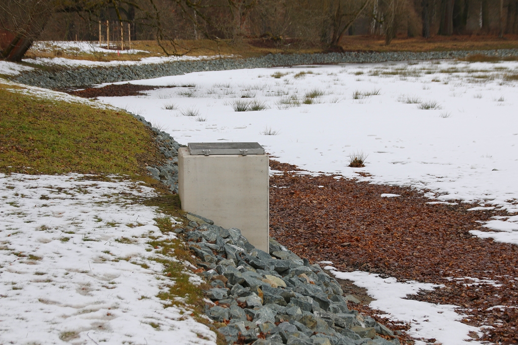 Nachfragen bei der Stiftung ergaben, dass das Ablaufbauwerk am Südende des Sees zu hoch ist, für den notwendigen Austausch gegen ein niedrigeres braucht es eine Senkung des Wasserstands. Dieser „Betonkasten“ ist der Überlauf des Parksees, hier läuft ab Erreichen des Höchstwasserstandes das Wasser ab in die Elster. Wundern darf man sich schon über den Fehler, zeigt doch das Foto des eingebauten Ablaufs vom Oktober 2025, dass er erstaunlich hoch über die ungefähre Ziel-Wasserstandslinie (Oberkante der Ufer-Steinschüttung) hinausragt.