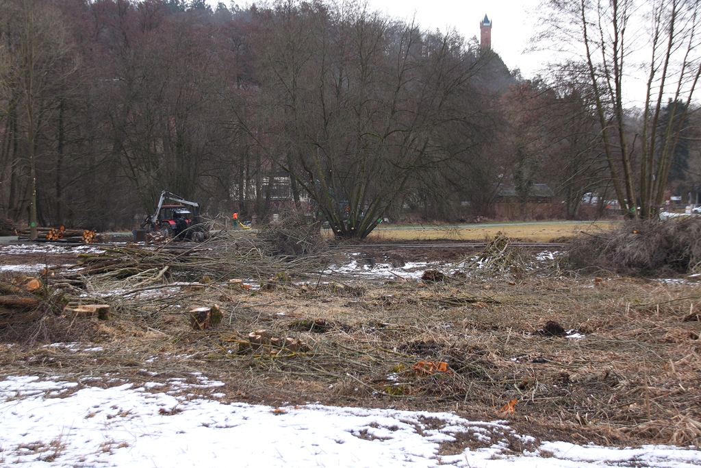 An der Baustelle „Vorstreckteiche“ dominieren immer noch Gehölzarbeiten, ein kleines Schild klärt nun über das Ziel der Arbeiten auf.
